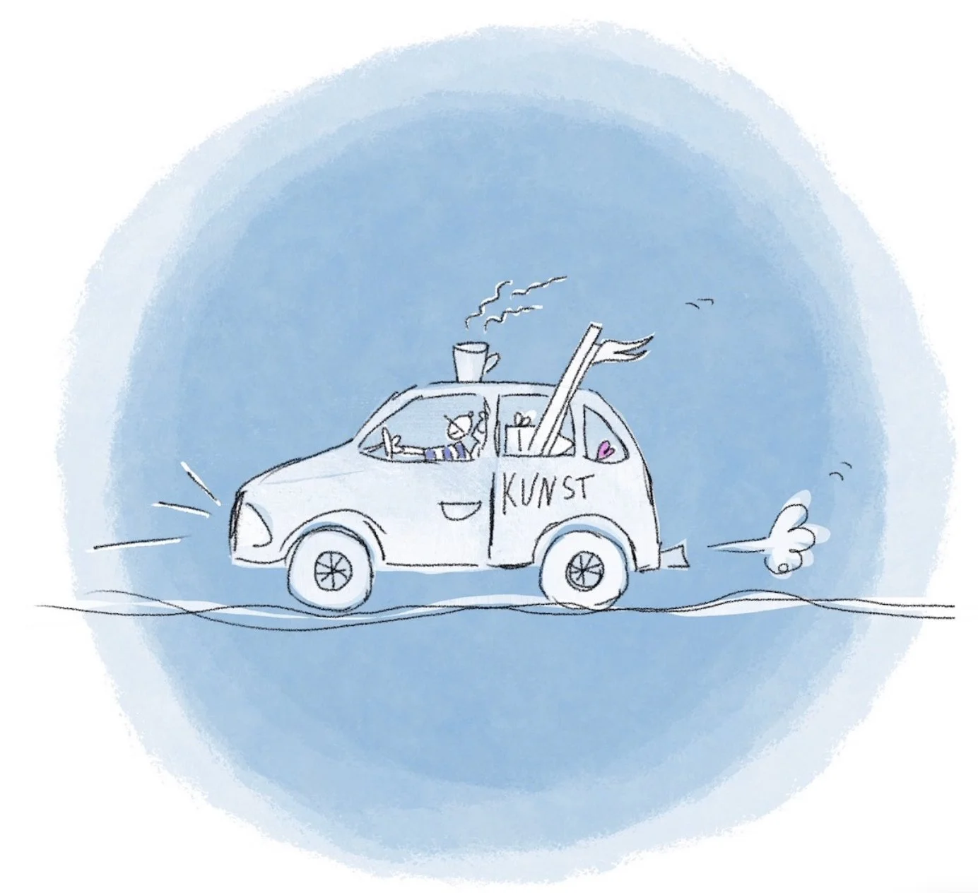 Das kleine Auto ist bis unters Dach vollgestopft mit unserer Kunst, es ist zu früh und ich hätte lieber mein Kopfkissen im Nacken statt Keilrahmen. Wir rollen über die Dörfer, im Augenwinkel Stoppelfelder mit hingewürfelten Strohballen.