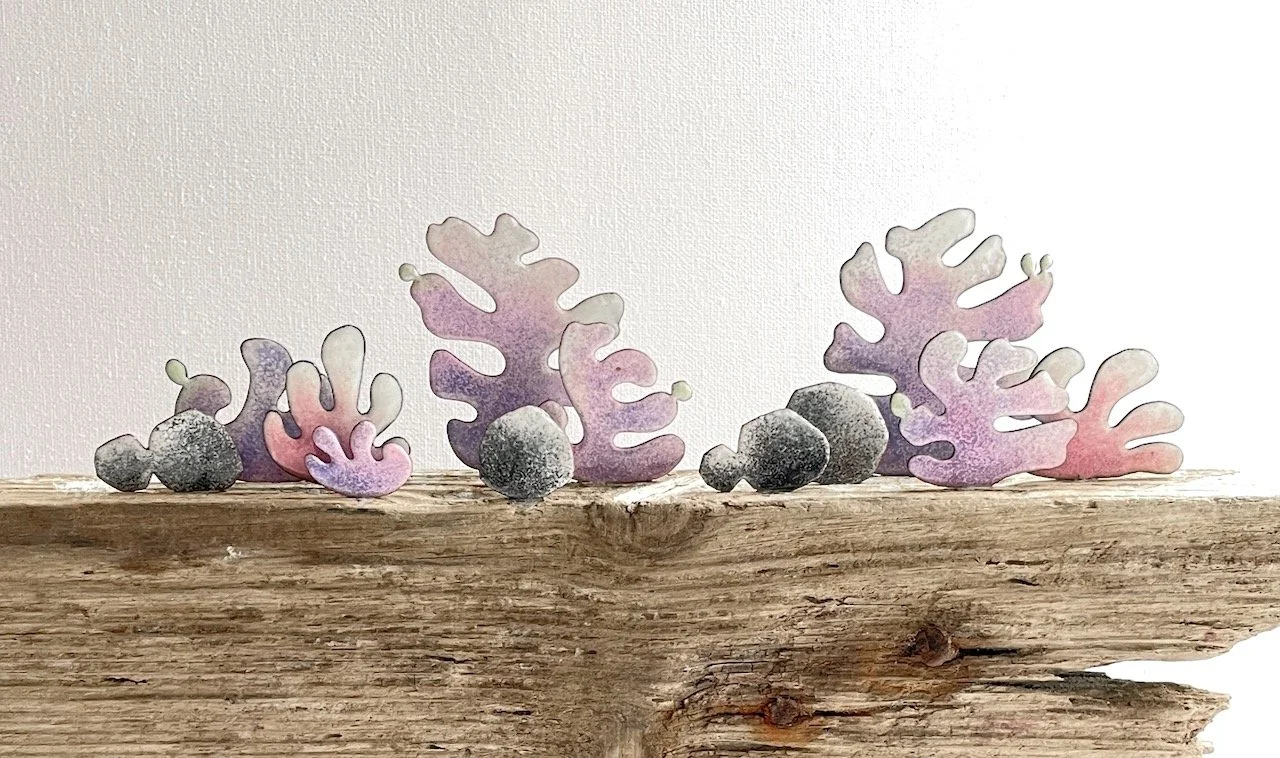 Nach dem Emaillieren arrangiere ich die einzelnen Elemente zu kleinen Gruppen auf Sockeln aus Fundholz, das ich auf meinen Streifzügen sammele.