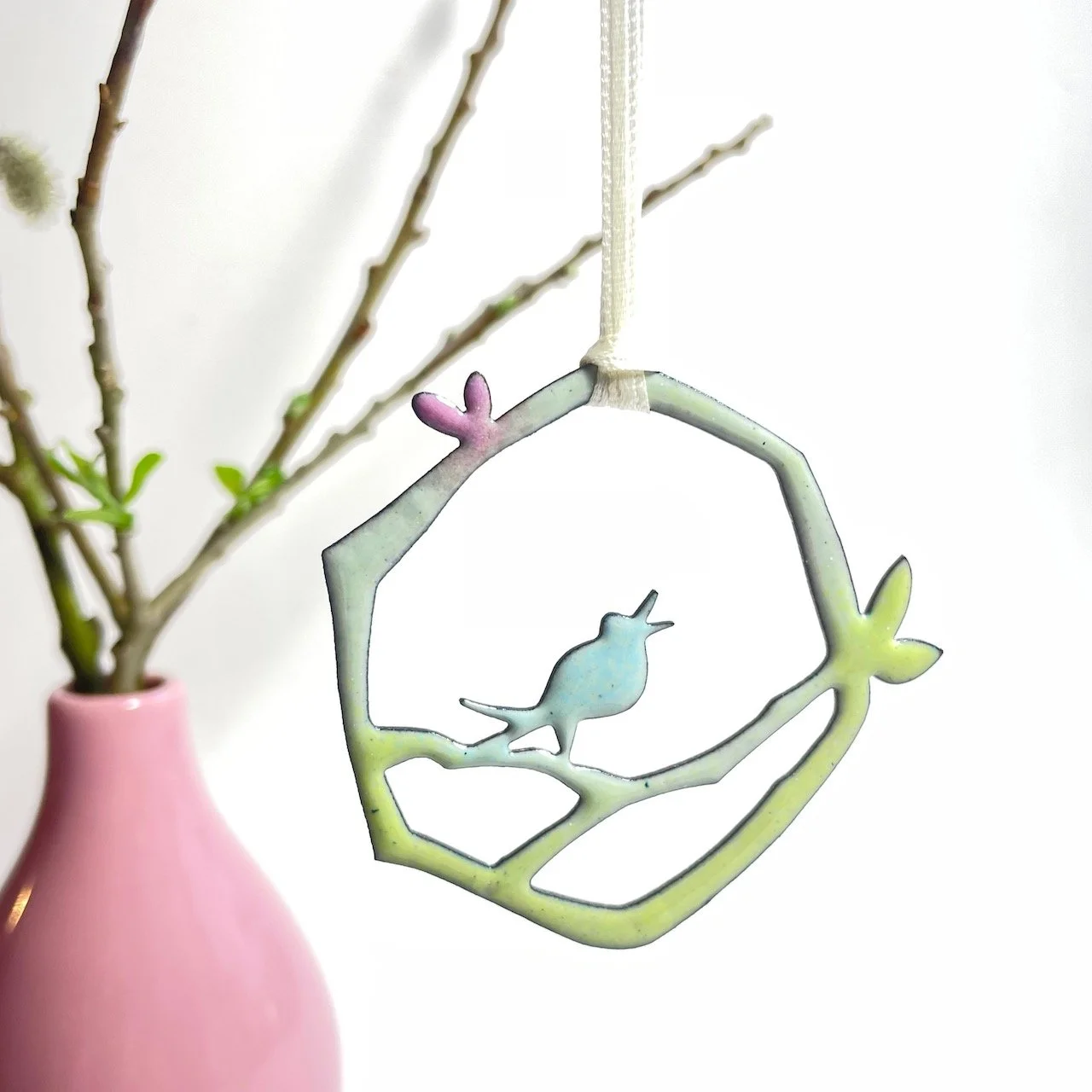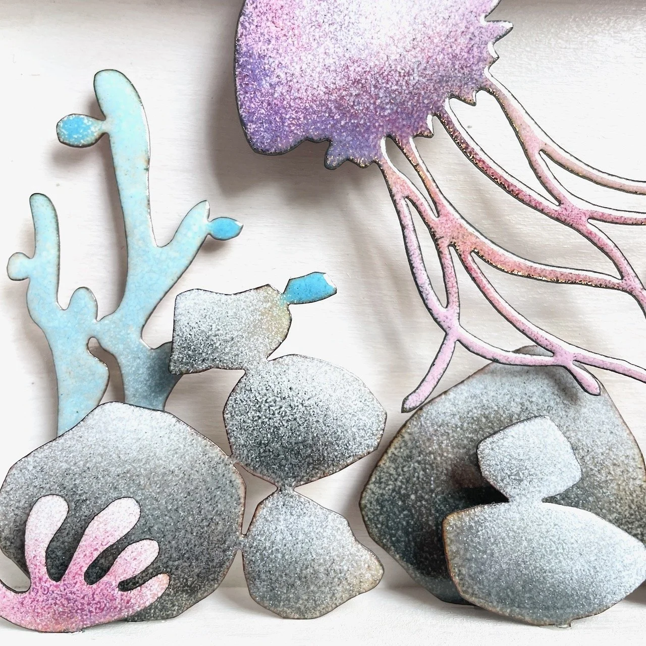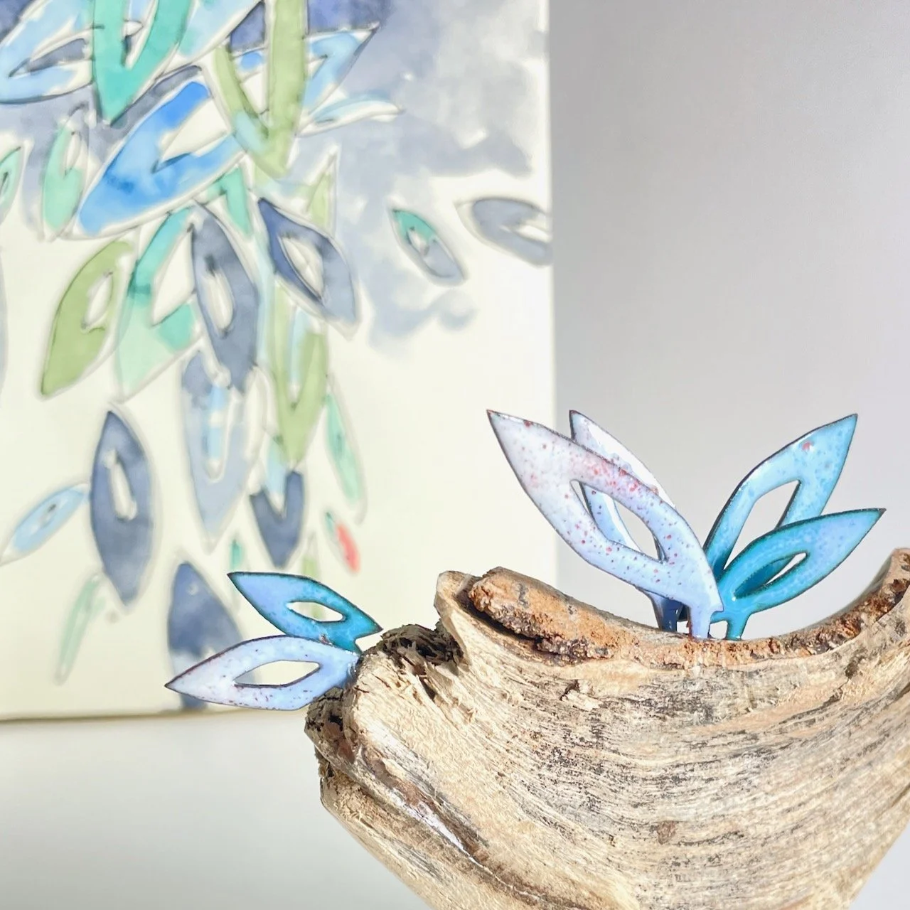 Was als lockere Aquarellzeichung auf Papier beginnt, wird in vielen handwerklichen Arbeitsschritten zur kleinen Skulptur aus vielschichtig emailliertem Kupfer. Fund - und Treibhölzer tragen die filigran gesägten Motive und sind die Brücke zur Natur, der unerschöpflichen Quelle für Idee und Inspiration.