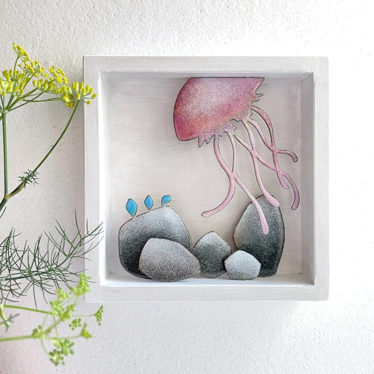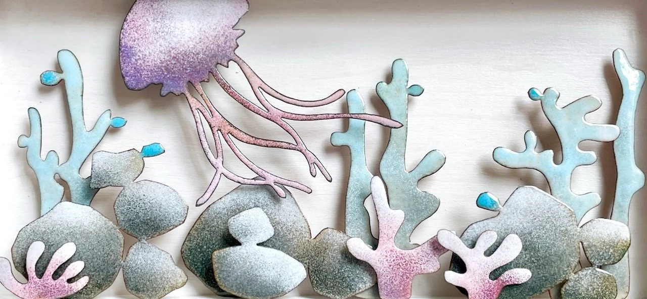 Am Werktisch entstehen von Hand aus Kupfer gesägte Raum - und Bildobjekte, emailliert mit opaken und transparenten Farben: