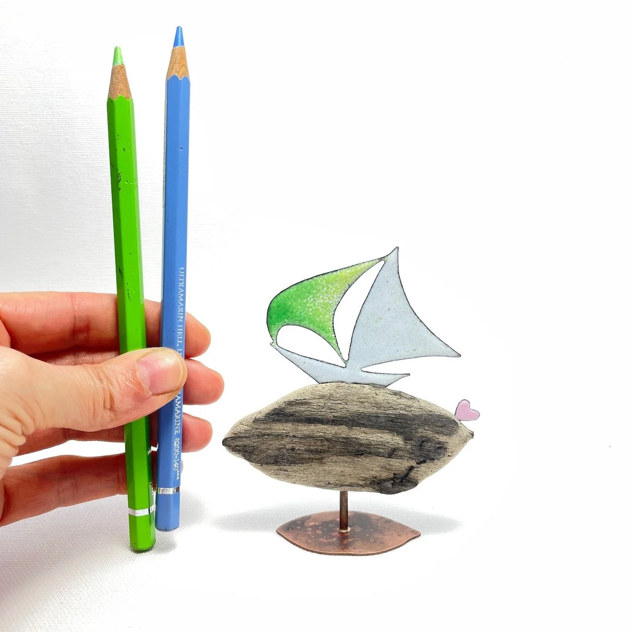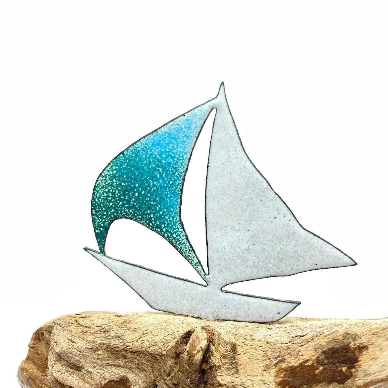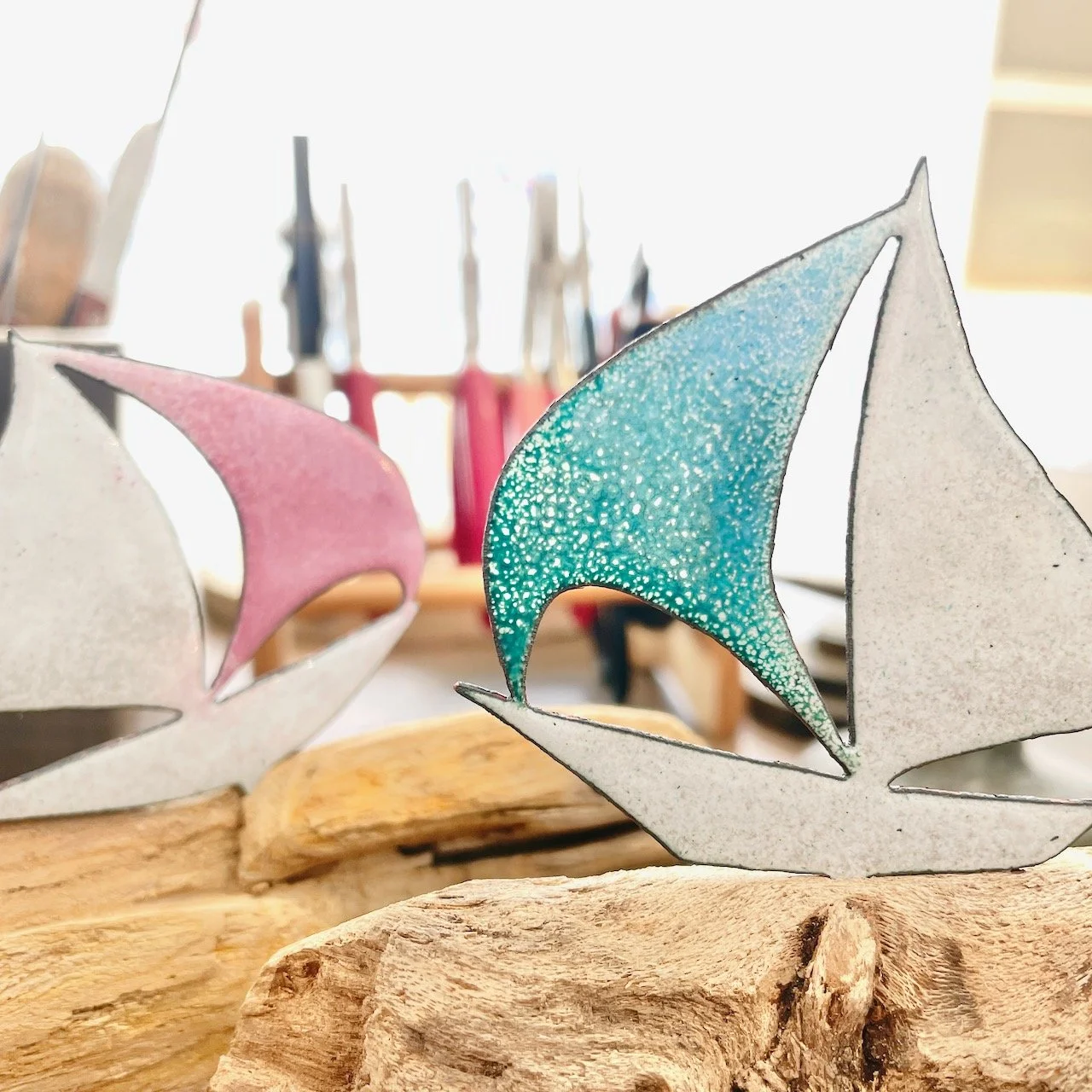 Farbenfrohe Segelboote, unterwegs zu neuen Abenteuern. Nach Freihandskizzen direkt auf Metall gezeichnet, von Hand mit der Laubsäge aus Kupfer gesägt und beidseitig emailliert. Getragen werden die kleinen Schiffe von ausgesuchten Treibhölzern, die ich an den Stränden von Nord - und Ostsee sammele.
