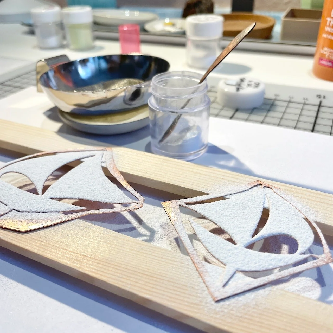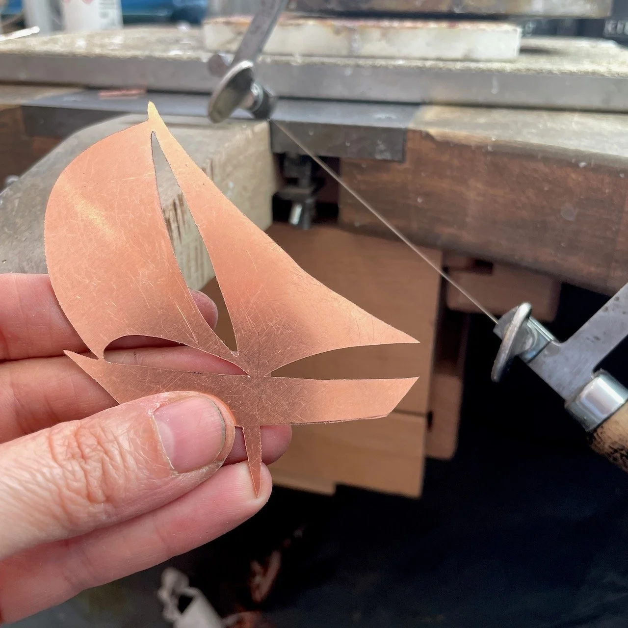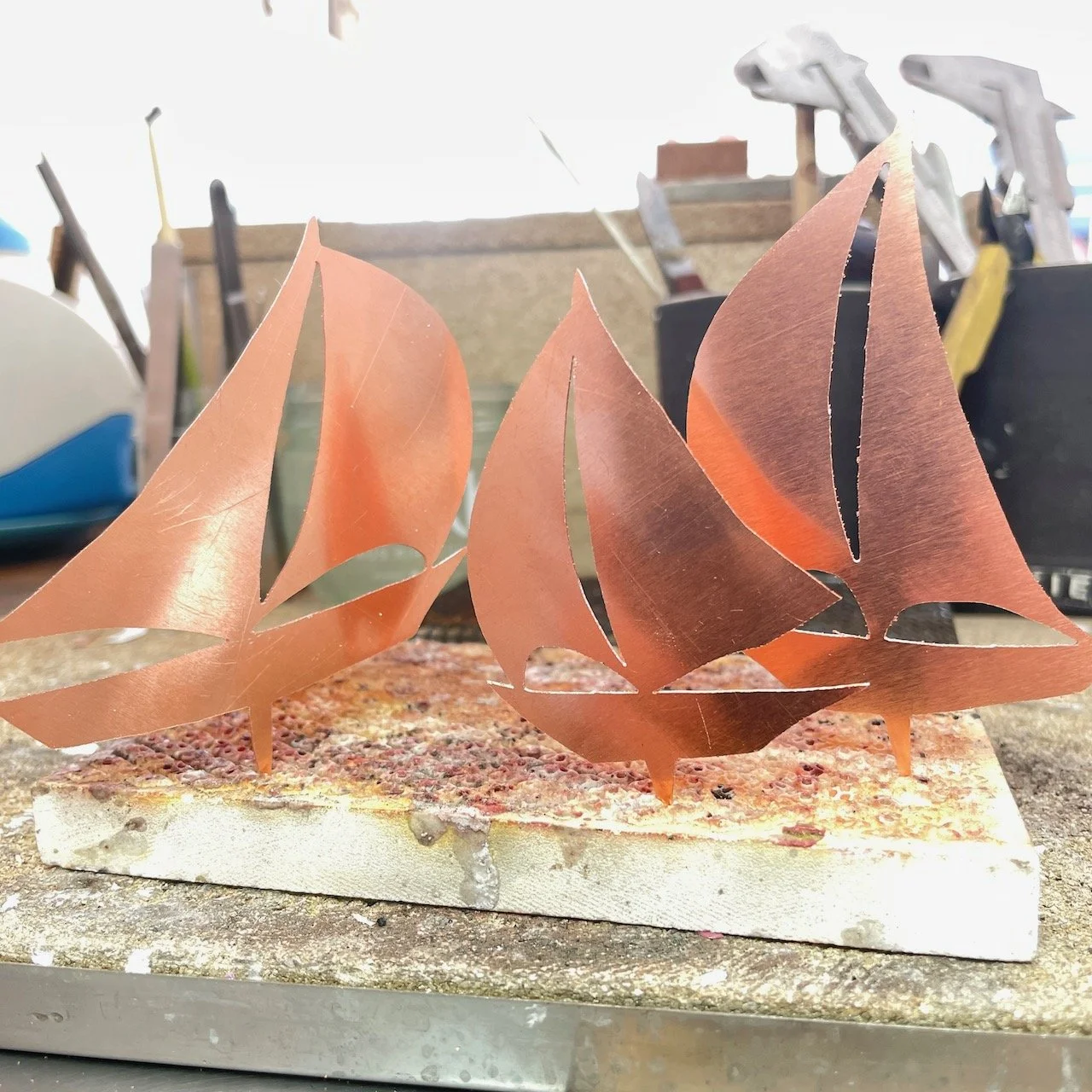 Farbenfrohe Segelboote, unterwegs zu neuen Abenteuern. Nach Freihandskizzen direkt auf Metall gezeichnet, von Hand mit der Laubsäge aus Kupfer gesägt und beidseitig emailliert. Getragen werden die kleinen Schiffe von ausgesuchten Treibhölzern, die ich an den Stränden von Nord - und Ostsee sammele.